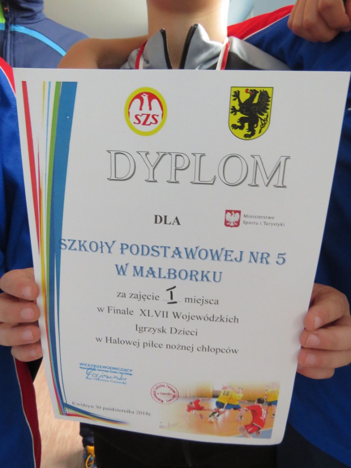 Drużyna piłkarska chłopców Szkoły Podstawowej nr 5 w Malborku zdobyła I miejsce w Finale XLVII Wojewódzkich Igrzysk Dzieci w Halowej Piłce Nożnej Chłopców.