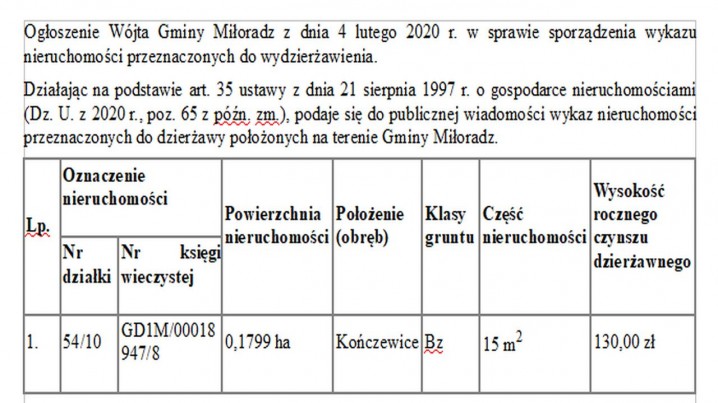 Działając na podstawie art. 35 ustawy z dnia 21 sierpnia 1997 r. o gospodarce nieruchomościami (Dz. U. z 2020 r., poz. 65 z późn. zm.), podaje się do publicznej wiadomości wykaz nieruchomości przeznaczonych do dzierżawy położonych na terenie Gminy Miłoradz.